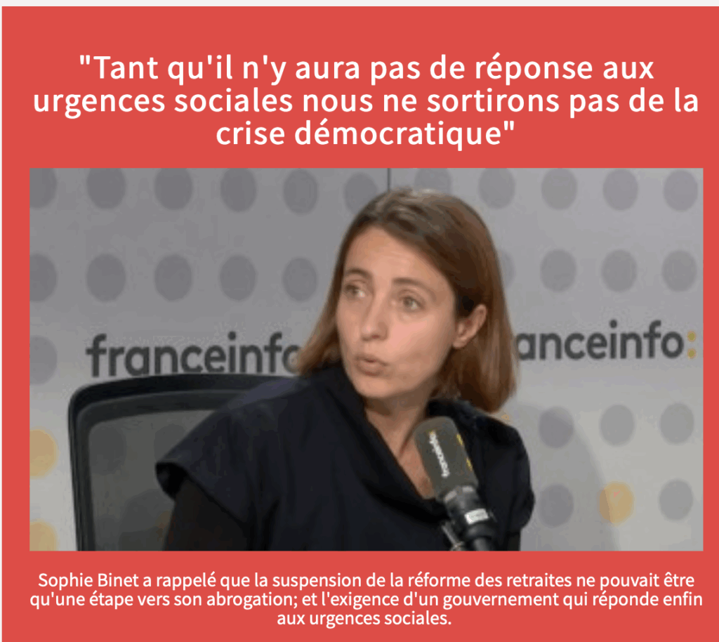 Sophie Binet était l’invitée de France Info mercredi 8 octobre, interrogée sur la suspension de la réforme des retraites, elle a rappelé que la suspension ne pouvait être qu’une étape vers son abrogation; et l’exigence d’un gouvernement qui réponde enfin aux urgences sociales.